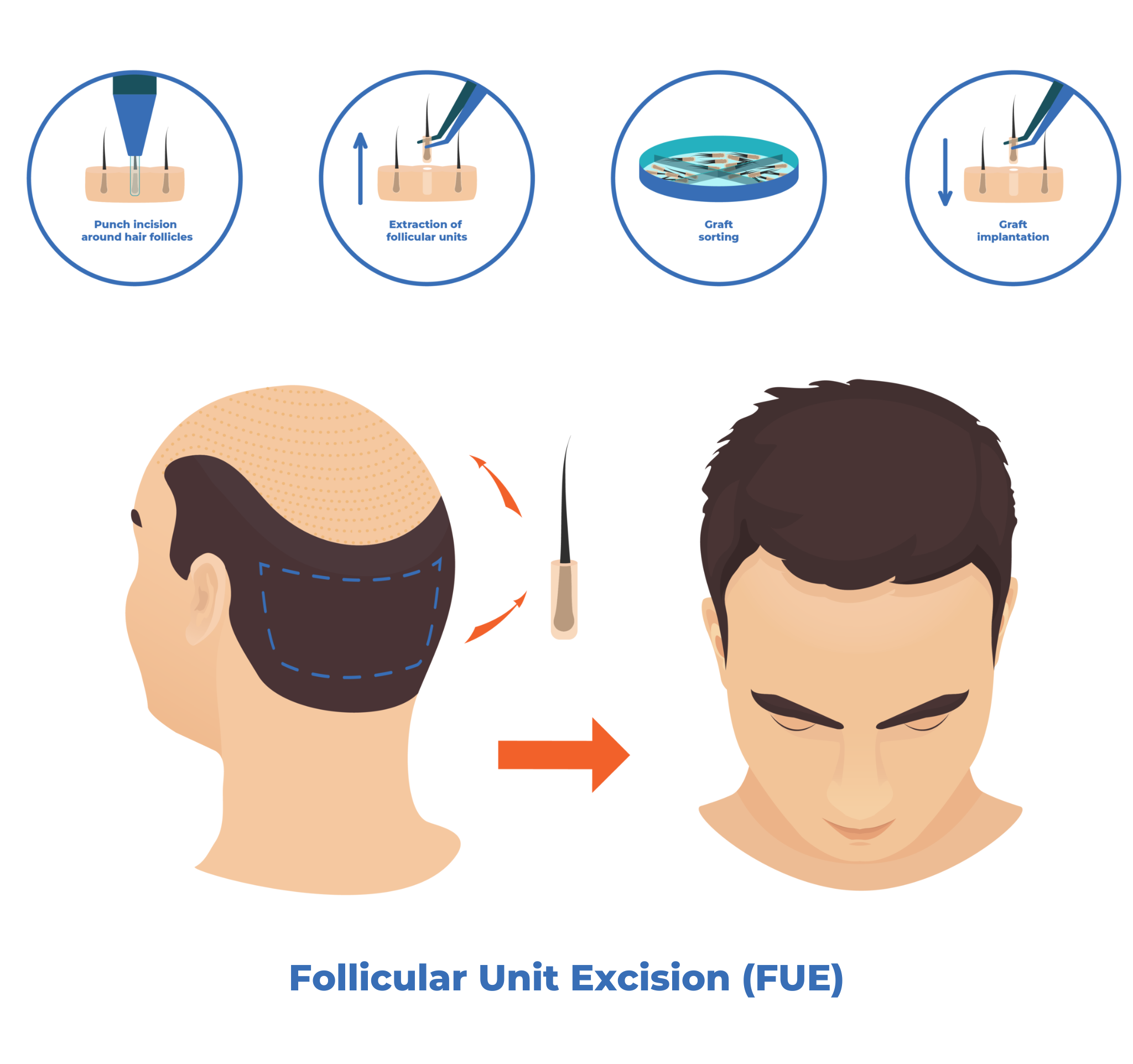 Follicular Unit Excision (FUE) is a donor harvesting technique in which follicular units are removed individually from the scalp in a single-step procedure. In contrast, FUT is a two-step method: a strip of tissue containing numerous follicular units is first removed, and the individual follicular units are then dissected from this tissue. After healing, FUE produces multiple small circular scars throughout the donor area, while FUT results in a single linear scar. However, unlike FUT, FUE generally allows the hair in the donor region to be clipped somewhat shorter without revealing the scar pattern.