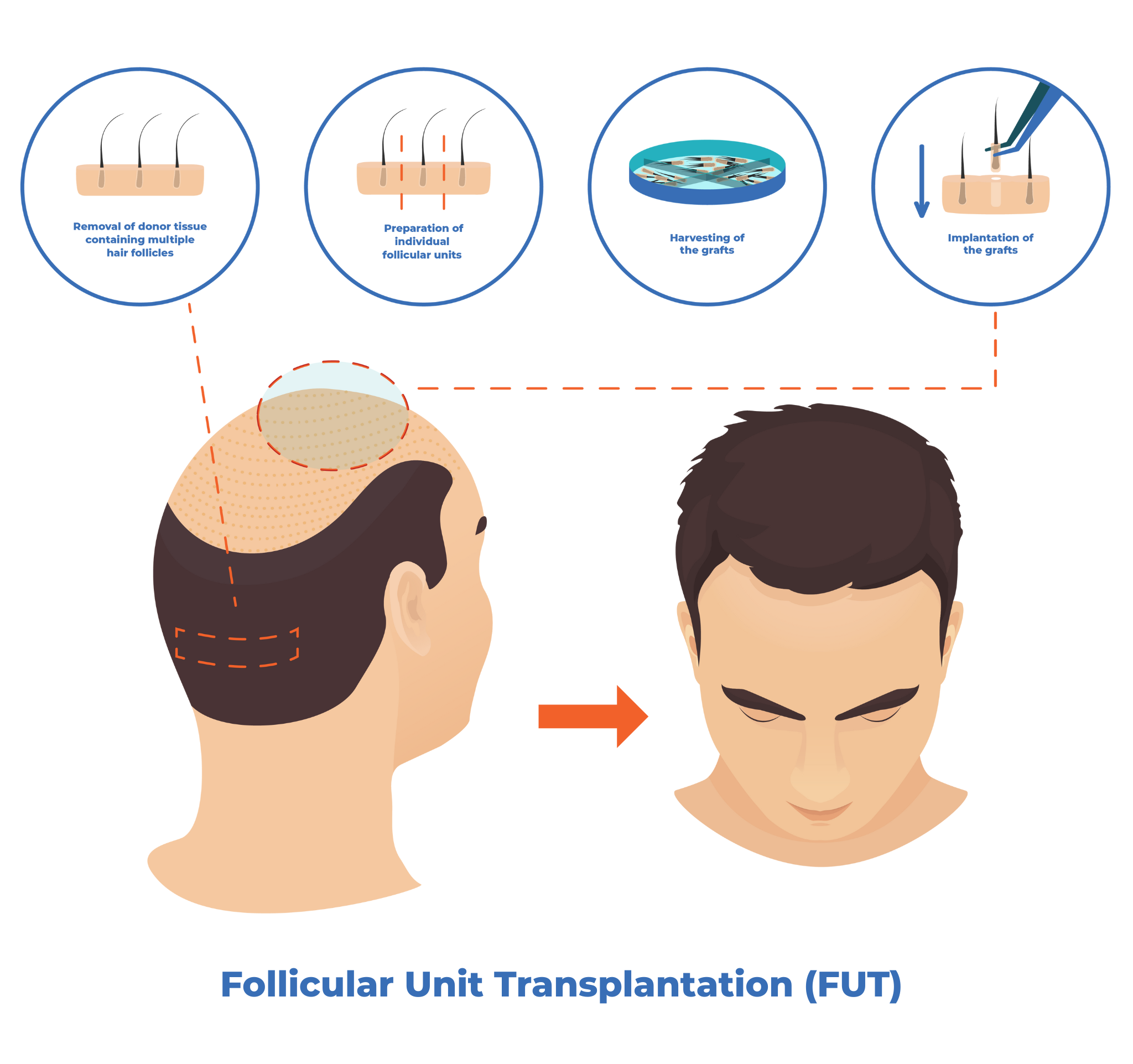 Follicular Unit Transplantation (FUT) is a method of donor hair harvesting in which a single strip of tissue containing multiple follicular units is removed from the donor area. A team of experienced staff then dissects this tissue to isolate individual follicular unit grafts (FUGs). After healing, patients are typically left with a thin linear scar that is virtually undetectable unless the scalp is shaved. With subsequent procedures, the existing donor scar is removed as part of the new harvest, allowing patients to maintain a single linear scar even after multiple surgeries.